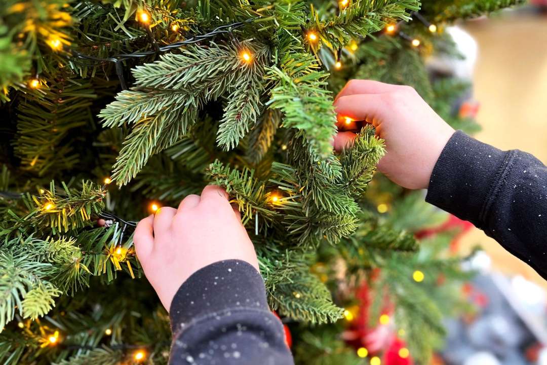 If your tree is not pre-lit, start by hanging your lights on the tree. It is recommended that you plug your lights in first, just to make sure they are in working order. Start at the bottom of the tree, working your way up. As you do so, weave the lights in and out of the branches. Find our guide of how many lights you need for your tree HERE.