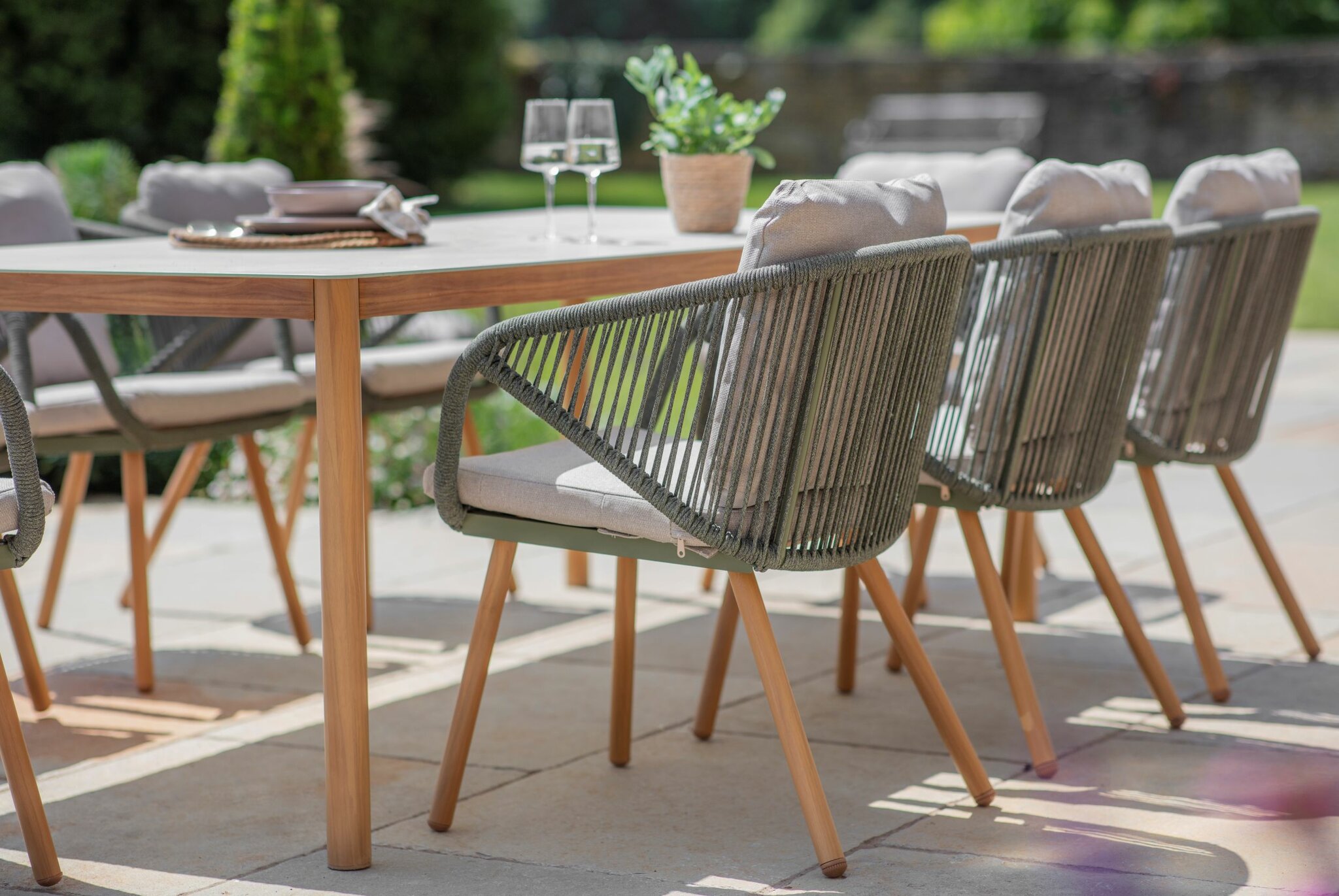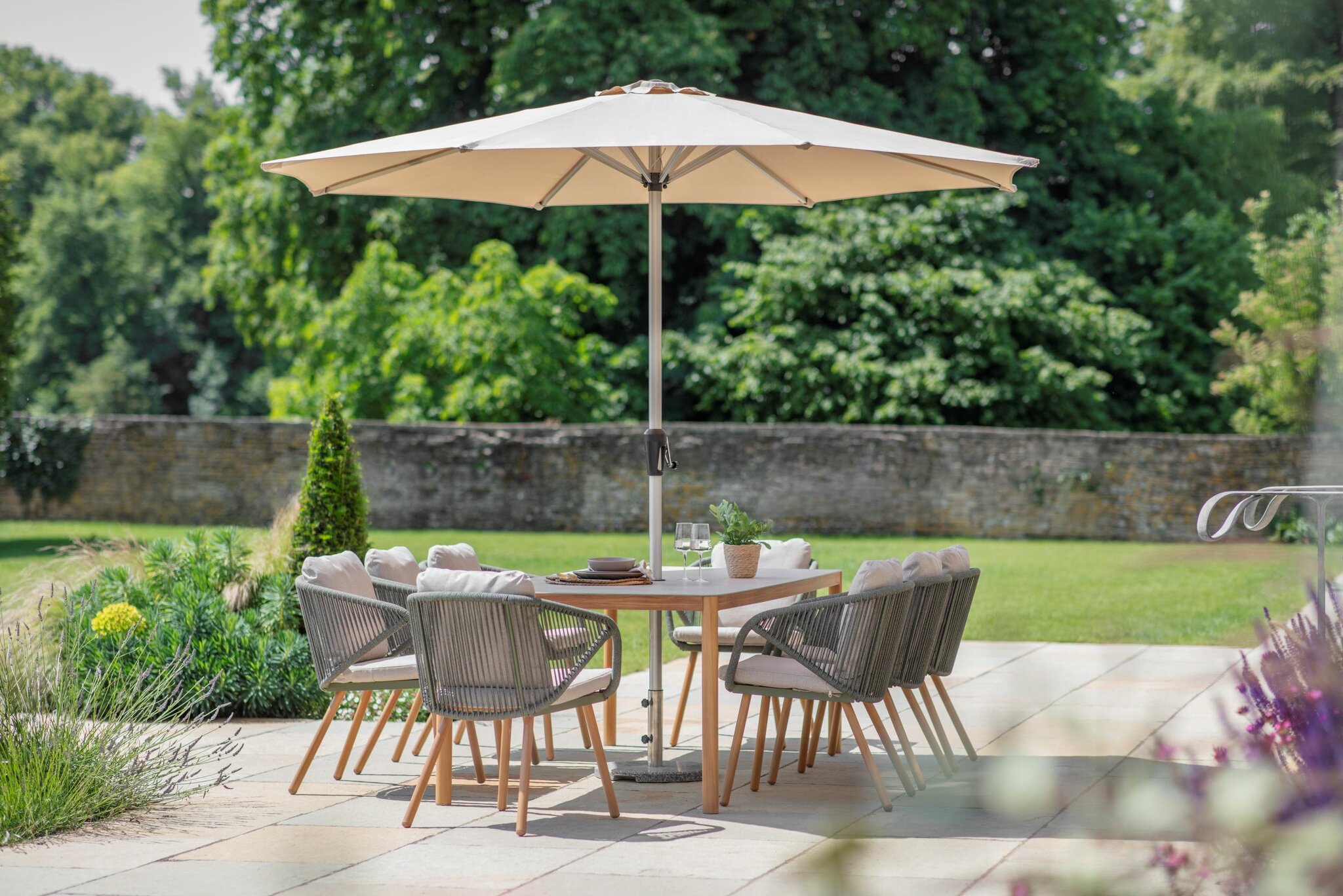 Host outdoor gatherings in style with the contemporary Helsinki 8-seat dining set in Fern Green – a fresh, natural tone that blends beautifully with nature. Featuring a sleek ceramic-effect table, eight rope-weave chairs with Pebble cushions, and a matching parasol with base, this set offers comfort, durability, and Scandi-inspired style - perfect for modern outdoor dining.
