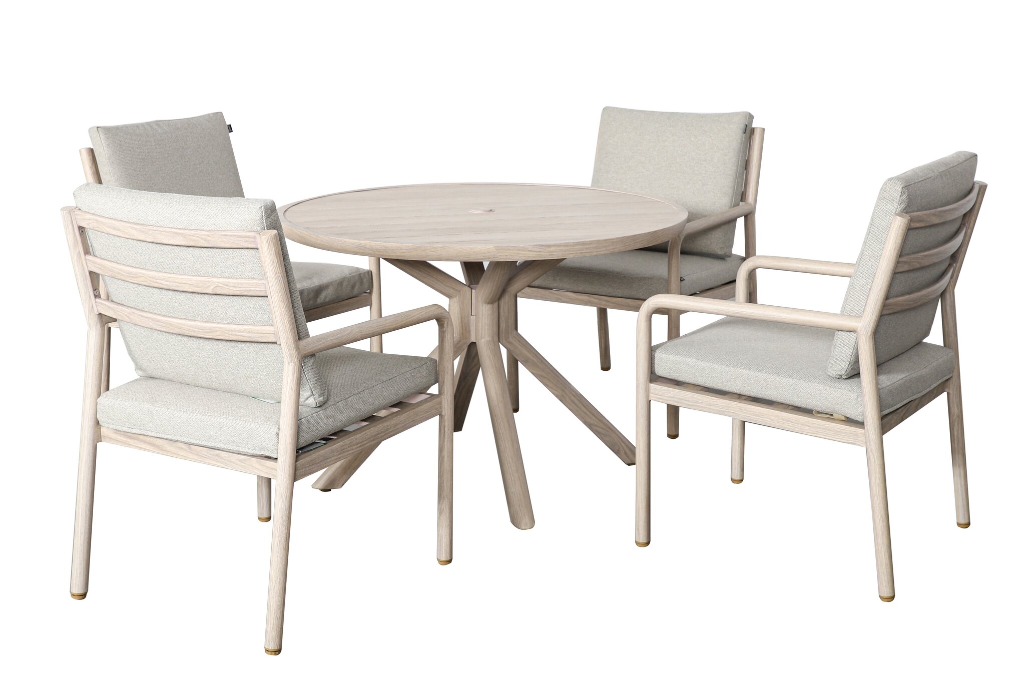 The Kalahari Dining Set brings contemporary elegance and compact comfort to smaller outdoor spaces. Crafted from Folie, a high-quality wood-look foiled aluminium, this stylish duo set perfectly replicates the natural warmth of timber while offering the resilience and easy maintenance of aluminium. The round bistro table features a sleek slatted design and a sturdy, stylish base — ideal for morning coffee, casual dining, or evening drinks. Two beautifully curved armchairs accompany the table, each fitted with deep, Weatherready® cushions in a soft neutral tone for lasting comfort and refined style. Lightweight yet robust, the Kalahari Dining Set is designed to withstand the elements while maintaining its modern, inviting appearance — a perfect choice for balconies, patios, or intimate garden corners.
