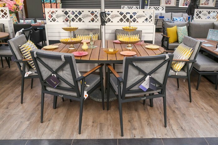 This spacious 6-seat dining set is ideal for garden gatherings. The aluminium table and chair frames ensure this set is lightweight and easy to maintain, whilst the wood finish to the tabletop and armrests adds sophistication, warmth and style. Complete with removable cushions and a grey crank handle parasol, this set will provide comfort from dawn until dusk.