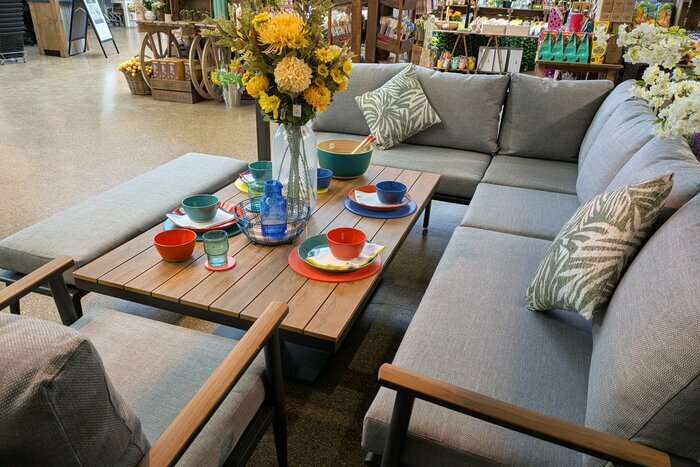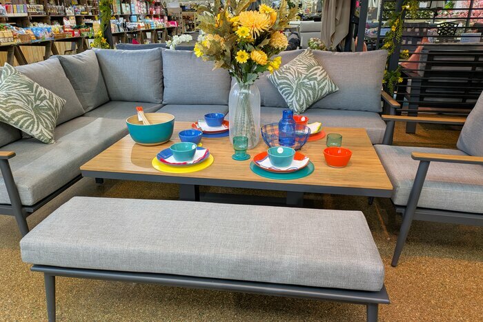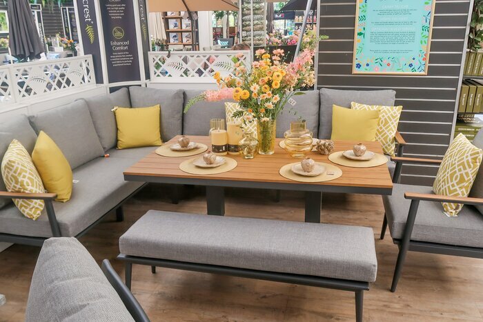 With ample room for all your guests, this simple yet chic set is versatile and perfect for outdoor entertaining. The corner-hugging L-shape sofa is complete with a bench and sofa chair, complemented with a stylish wood effect and height-adjustable table making it ideal for casual drinks or more formal dining.