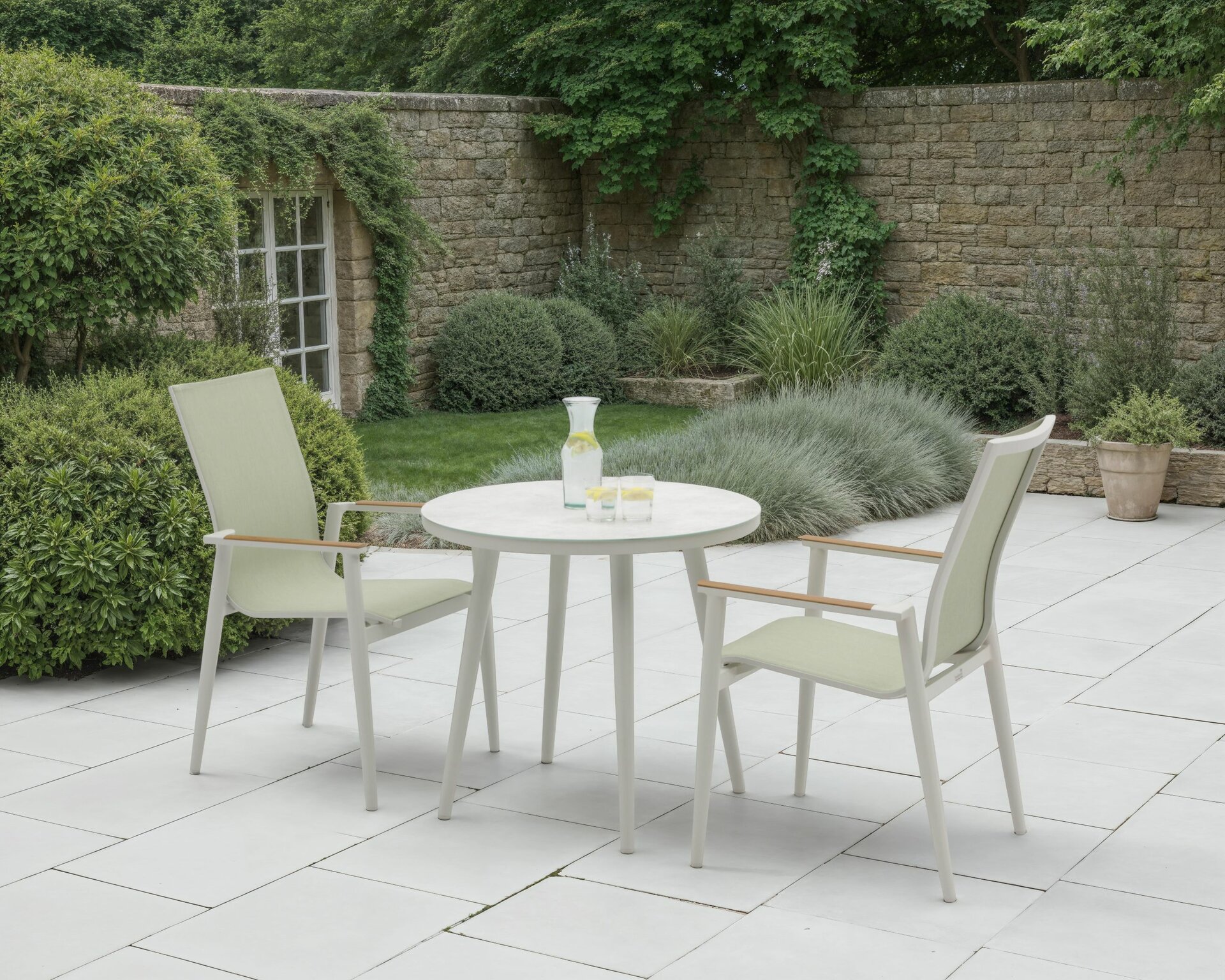 The Sofia Bistro Set with 2 Armchairs in Green is perfect for relaxed mornings, evening drinks, or intimate dining. Its compact round table pairs beautifully with two stackable Textilene chairs, offering breathable comfort and easy care. Crafted from durable aluminium with weather-resistant materials, this set is designed to remain outdoors season after season.