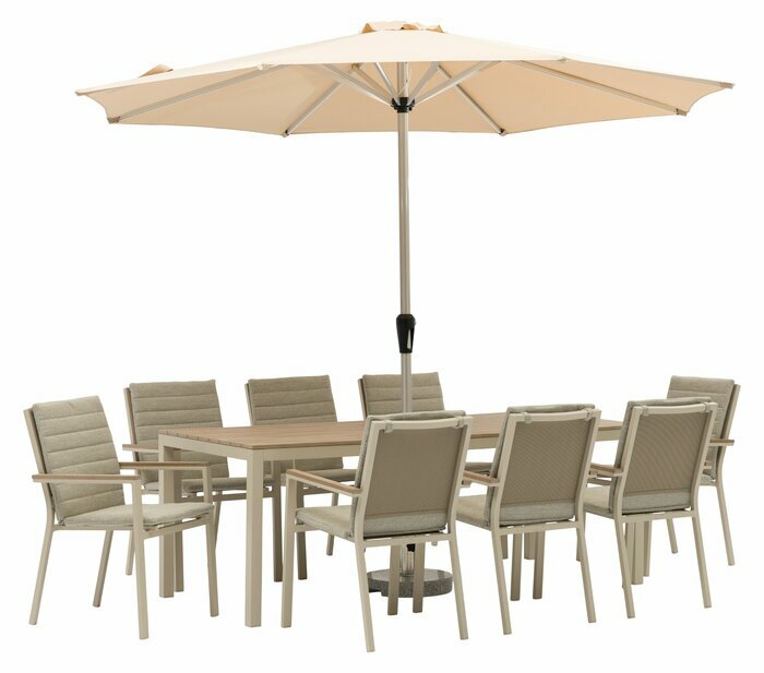 The Zurich 8 seat Dining Set is all about the simple pleasures of eating outdoors with friends and family. With laid-back lines and an angular profile, the focus is on sleek style and thoughtful details. The rectangular 'tree-free' tabletop and armrests give the appearance of real wood with the benefit of being lightweight, low-maintenance and easy to clean. Removable Eco Fawn Linen chair cushions and a matching parasol complement the warm Mocha table and chair frames, keeping you cool and comfortable dining outdoors.